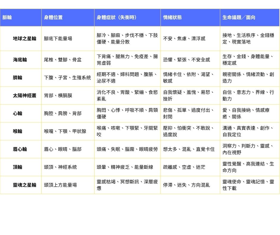 ✦ 0~8 脈輪失衡一覽表(簡易對照)