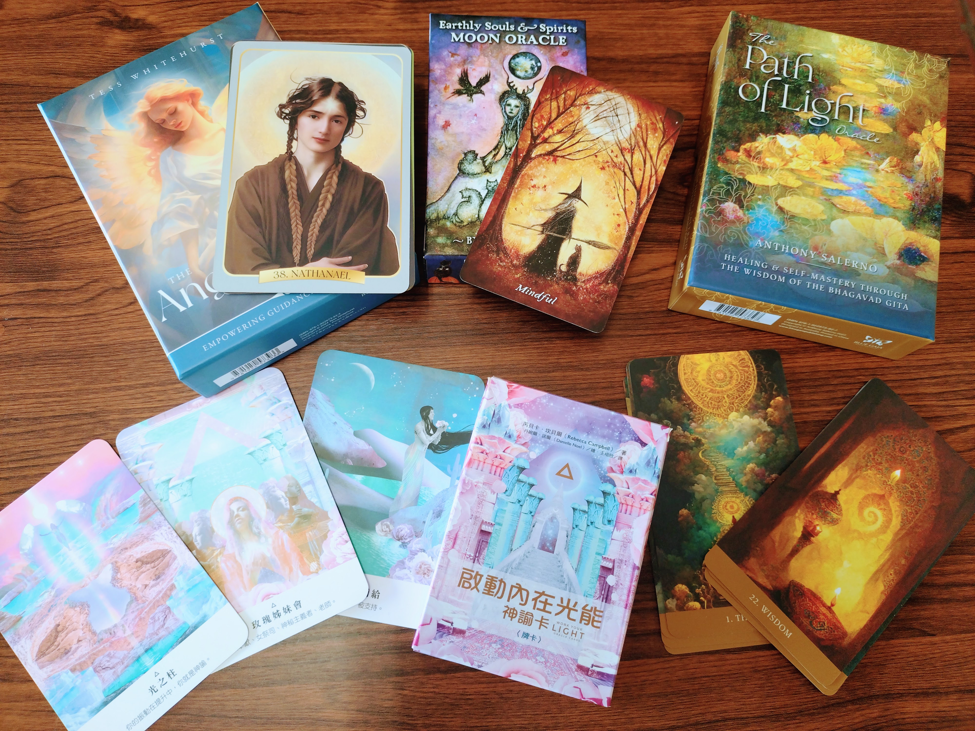 如觀音神諭卡、內在光能神諭卡、水晶卡、月亮顯化神諭卡、神聖芳療卡等