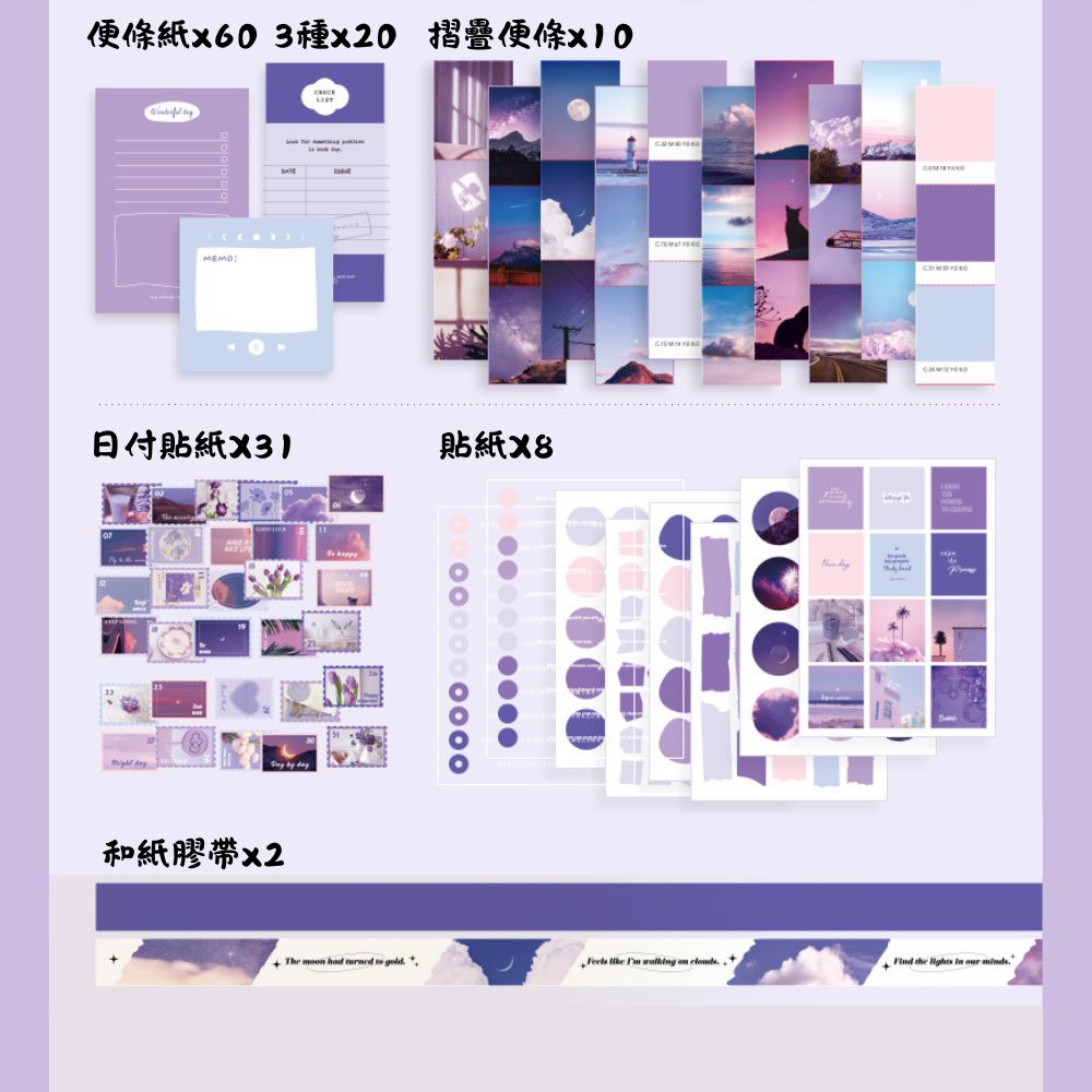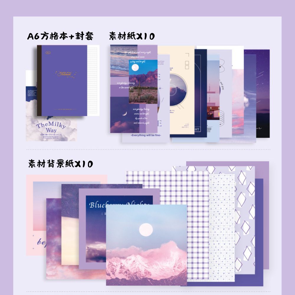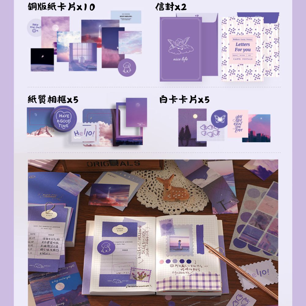 《手帳禮盒-月光來信》紫色浪漫風格,文青感十足,拼貼、a6記事本、便條紙、貼紙,手帳套組