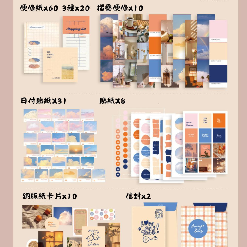 《手帳禮盒-美好夕陽》橙橘色系,浪漫餘暉,文青感十足,拼貼、a6記事本、便條紙、貼紙,手帳套組
